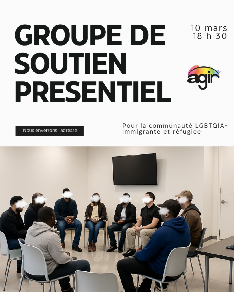 Rejoignez le groupe de soutien d’AGIR, un cercle confidentiel et accueillant pour les personnes immigrantes et réfugié·e·s LGBTQIA+. C’est un espace pour être écouté·e, trouver une communauté et savoir que vous n’êtes pas seul·e. Toutes les identités et expériences y sont respectées.
