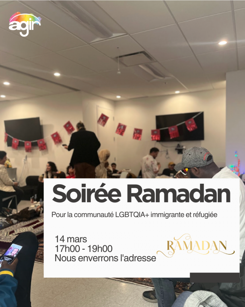 Le Ramadan brille davantage lorsqu’on le célèbre ensemble. AGIR organise une soirée spéciale du Ramadan pour les personnes immigrantes et réfugié·e·s LGBTQIA+, afin de se connecter, partager un repas et célébrer ce mois sacré dans un espace sécuritaire et bienveillant.